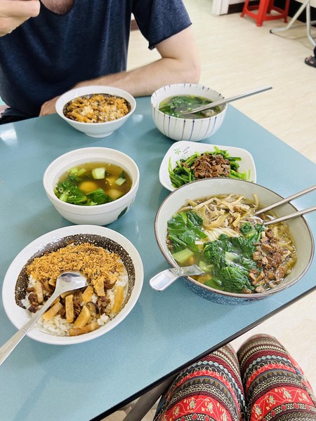 A few times we explored the area up north by scooter, one day doing an excellent hike up Dulan mountain that offered views both towards the sea and the inland valley through the jungle canopy. Some days most of our time was spent in the hotel’s common area reading, drawing or chatting with the owner and helpers. One morning we all went to see the sunrise at the coast and had delicious water-fried dumplings (a very typical breakfast dish) afterwards. Another highlight were the many great vegetarian restaurants we found, 4 of them we visited more than once, tasting many plant-based dishes new to us. There are the variations on Chinese/Taiwanese classics like Wonton dumplings, minced-meat rice, but with tofu/mushroom-based meat replacements, there are the buffet restaurants with all kinds of vegetable dishes and of course there’s also good old fried rice with mushrooms. We tasted many vegetables new to us, unfortunately we did not do a good job at recording their names … Shiwen became a regular at her favorite milktea shop close to the hotel and Jannes had to get his daily fruit juice at one of the many places throughout town. We even found a spacious gym that made an exception to let us pay per visit. Overall we quickly felt pretty settled in Taitung, which made it hard to move on when we did eventually.